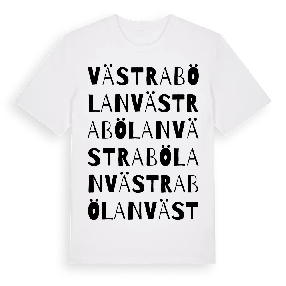Västra Bölan ordlek t-shirt är inspirerad av byn Västra Bölan i Gävleborgs län, Sverige. Tröjan är designad för dig som har en speciell koppling till platsen – oavsett om du bor här, har rötterna här eller bara älskar Västra Bölan.