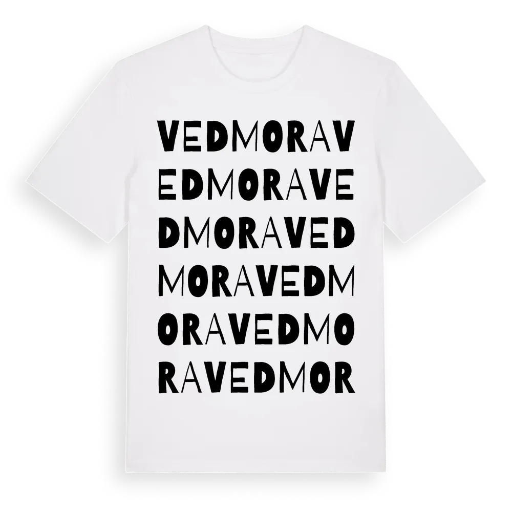 Vedmora ordlek t-shirt är inspirerad av byn Vedmora i Gävleborgs län, Sverige. Tröjan är designad för dig som har en speciell koppling till platsen – oavsett om du bor här, har rötterna här eller bara älskar Vedmora.