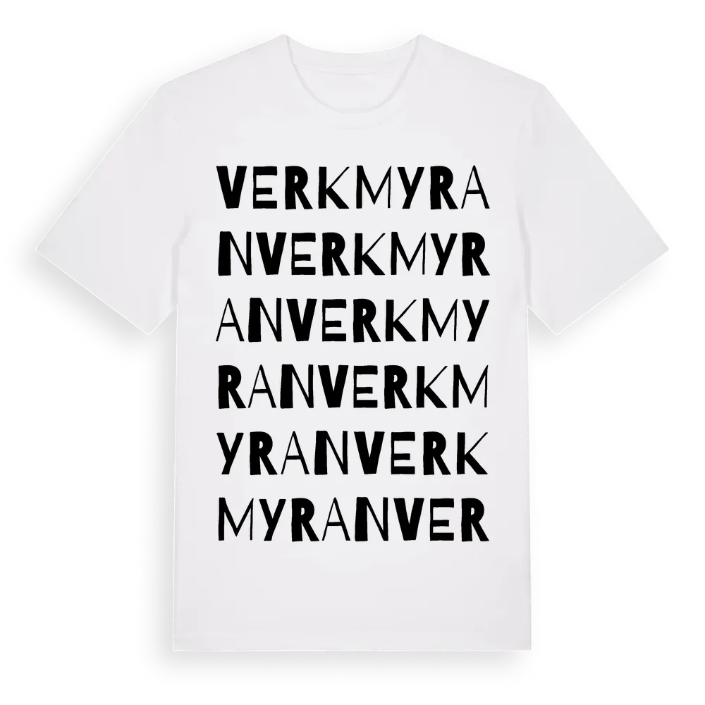 Verkmyran ordlek t-shirt är inspirerad av Verkmyran i Gävleborgs län, Sverige. Tröjan är designad för dig som har en speciell koppling till platsen – oavsett om du bor här, har rötterna här eller bara älskar Verkmyran.