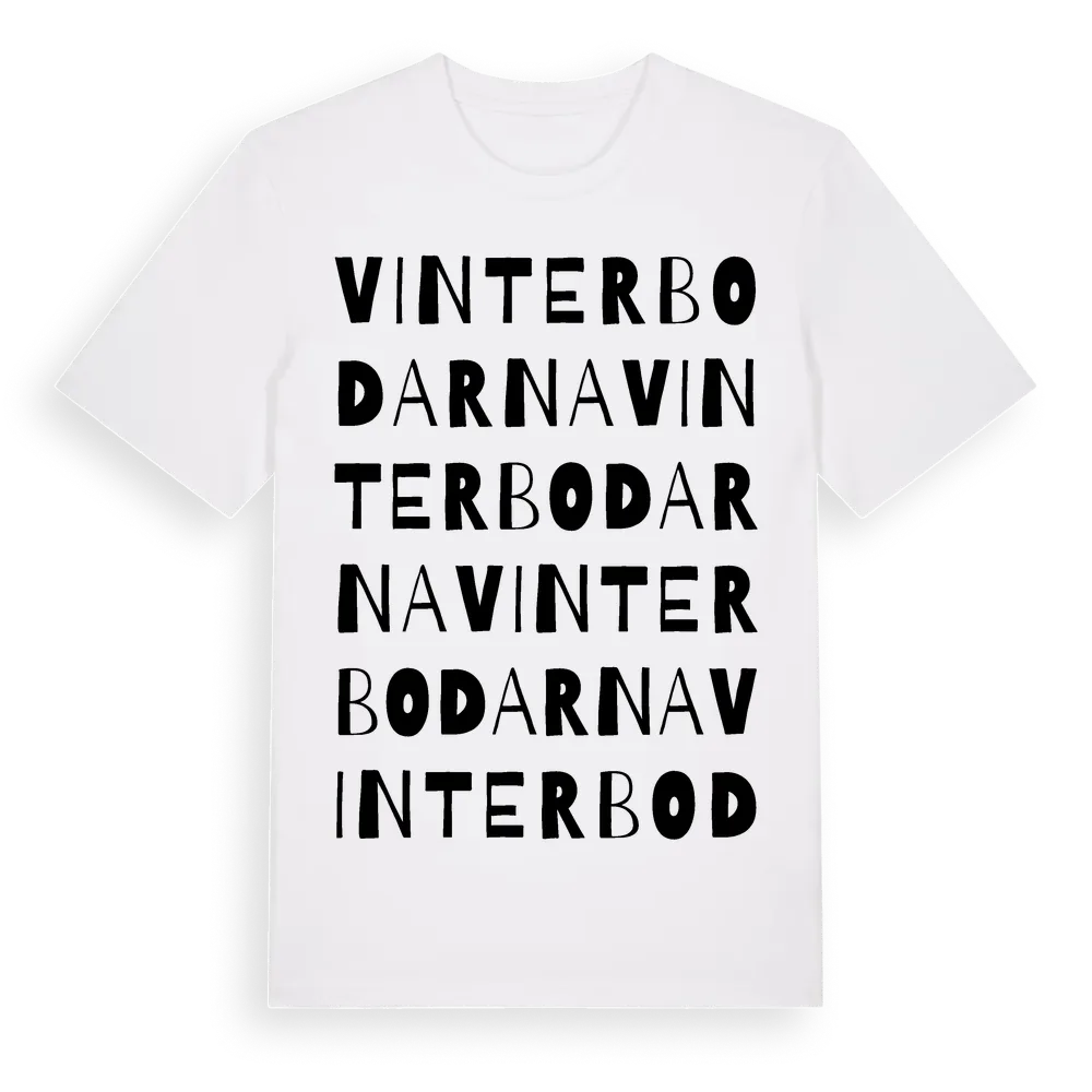 Vinterbodarna ordlek t-shirt är inspirerad av Vinterbodarna i Gävleborgs län, Sverige. Tröjan är designad för dig som har en speciell koppling till platsen – oavsett om du bor här, har rötterna här eller bara älskar Vinterbodarna.