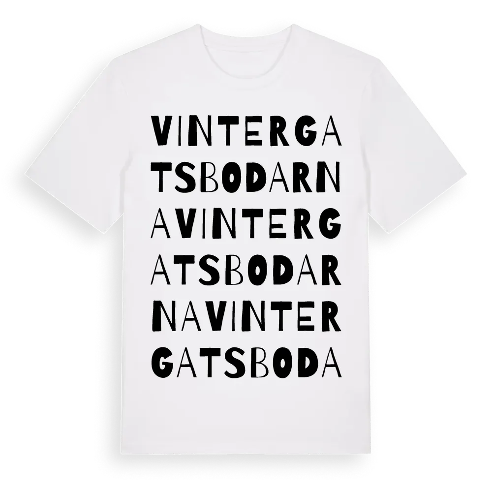 Vintergatsbodarna ordlek t-shirt är inspirerad av Vintergatsbodarna i Gävleborgs län, Sverige. Tröjan är designad för dig som har en speciell koppling till platsen – oavsett om du bor här, har rötterna här eller bara älskar Vintergatsbodarna.