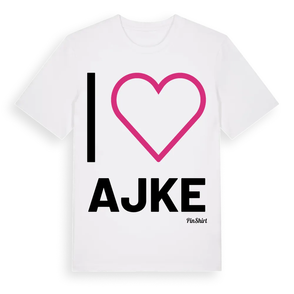 Det klassiska "I ❤ Ajke"-motivet i stort format som täcker hela bröstet. För dig som vill visa kärleken till Ajke på riktigt. Premium bomull, unisex – från byn Ajke i Gotlands län.