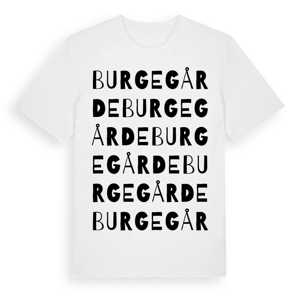 Burgegårde ordlek t-shirt är inspirerad av Burgegårde i Gotlands län, Sverige. Tröjan är designad för dig som har en speciell koppling till platsen – oavsett om du bor här, har rötterna här eller bara älskar Burgegårde.