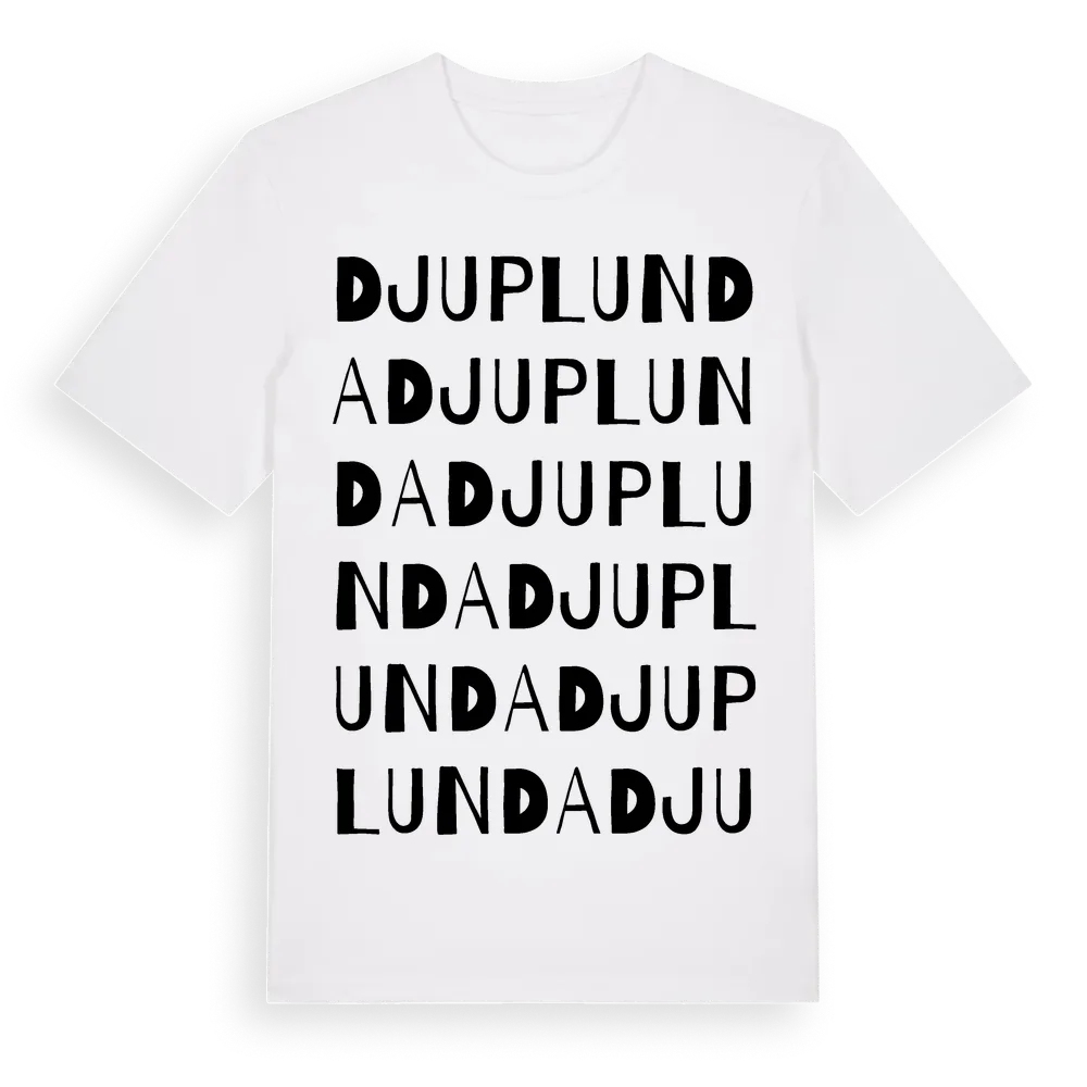 Djuplunda ordlek t-shirt är inspirerad av stadsdelen Djuplunda i Gotlands län, Sverige. Tröjan är designad för dig som har en speciell koppling till platsen – oavsett om du bor här, har rötterna här eller bara älskar Djuplunda.