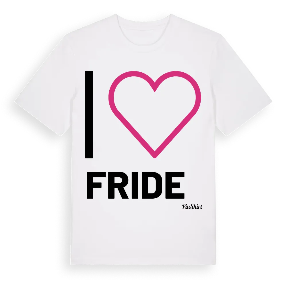 Det klassiska "I ❤ Fride"-motivet i stort format som täcker hela bröstet. För dig som vill visa kärleken till Fride på riktigt. Premium bomull, unisex – från Fride i Gotlands län.