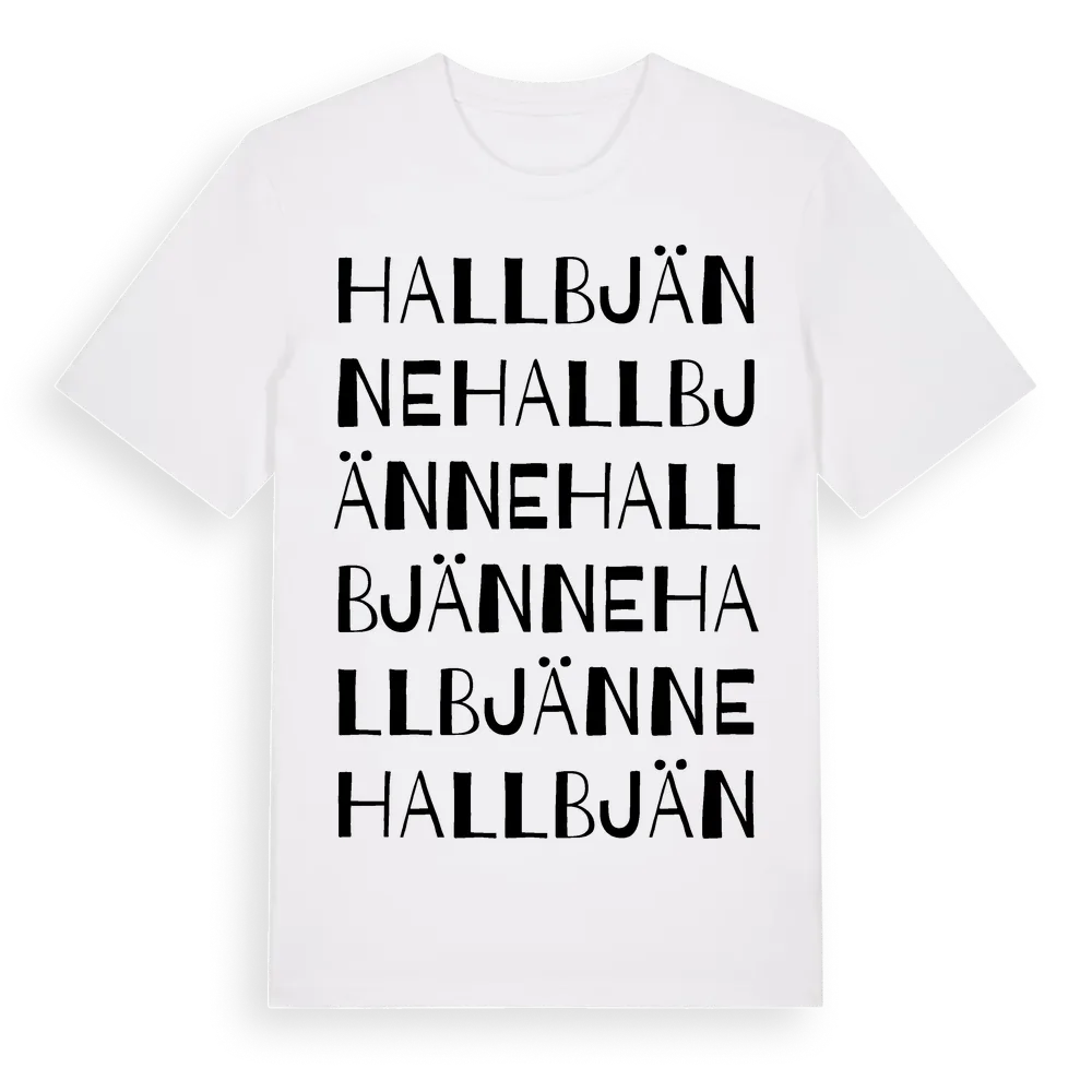 Hallbjänne ordlek t-shirt är inspirerad av Hallbjänne i Gotlands län, Sverige. Tröjan är designad för dig som har en speciell koppling till platsen – oavsett om du bor här, har rötterna här eller bara älskar Hallbjänne.