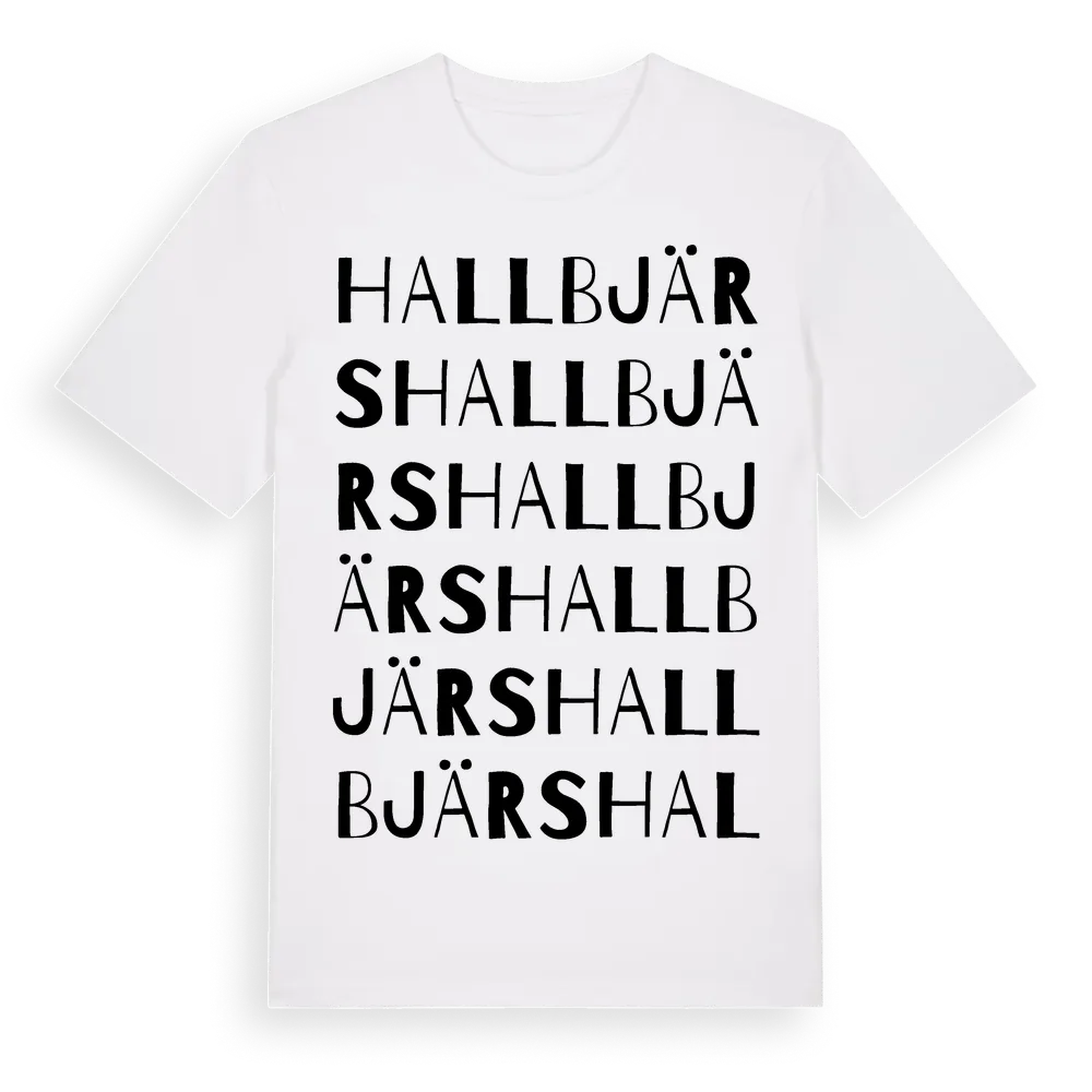 Hallbjärs ordlek t-shirt är inspirerad av Hallbjärs i Gotlands län, Sverige. Tröjan är designad för dig som har en speciell koppling till platsen – oavsett om du bor här, har rötterna här eller bara älskar Hallbjärs.
