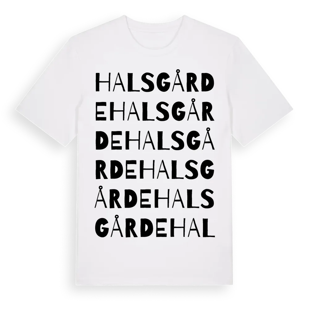 Halsgårde ordlek t-shirt är inspirerad av Halsgårde i Gotlands län, Sverige. Tröjan är designad för dig som har en speciell koppling till platsen – oavsett om du bor här, har rötterna här eller bara älskar Halsgårde.