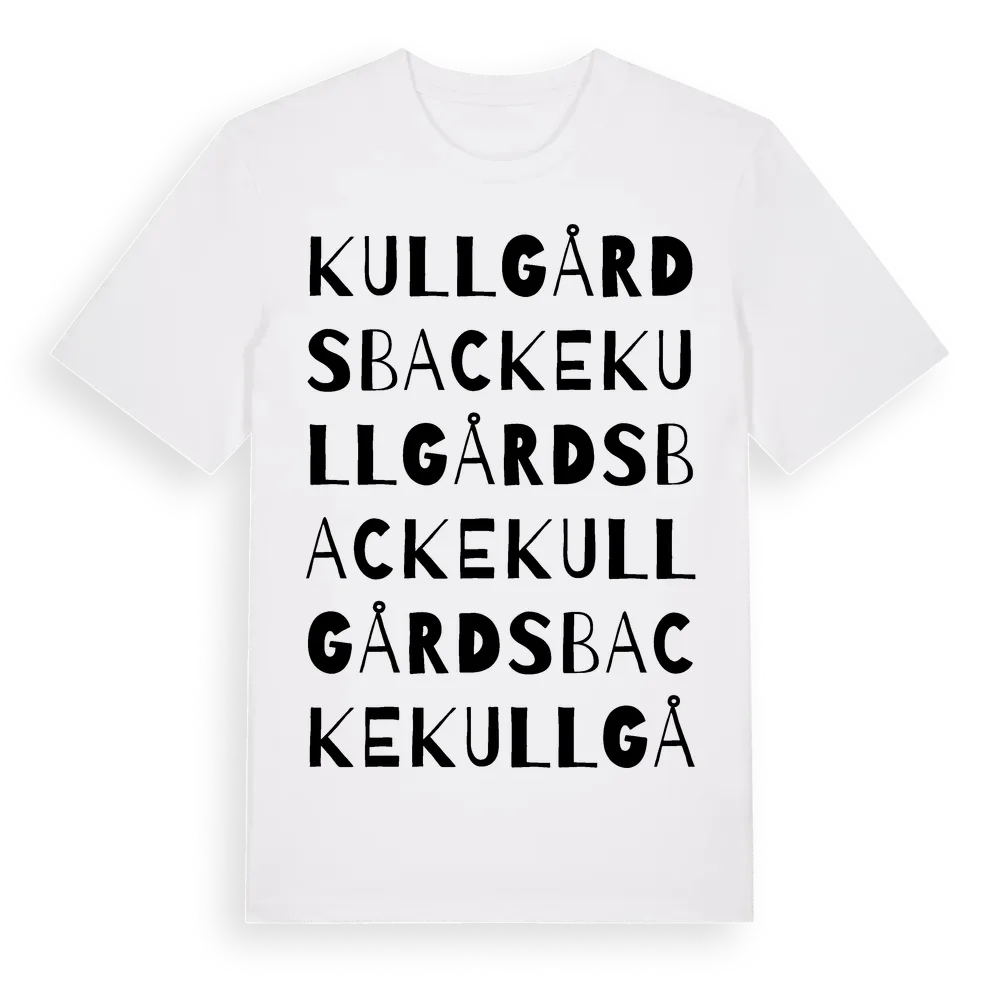 Kullgårds Backe ordlek t-shirt är inspirerad av Kullgårds Backe i Gotlands län, Sverige. Tröjan är designad för dig som har en speciell koppling till platsen – oavsett om du bor här, har rötterna här eller bara älskar Kullgårds Backe.