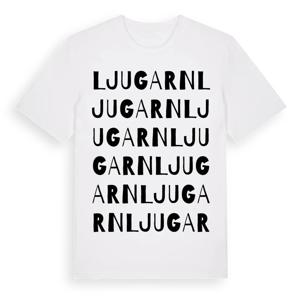Ljugarn ordlek t-shirt är inspirerad av byn Ljugarn i Gotlands län, Sverige. Tröjan är designad för dig som har en speciell koppling till platsen – oavsett om du bor här, har rötterna här eller bara älskar Ljugarn.
