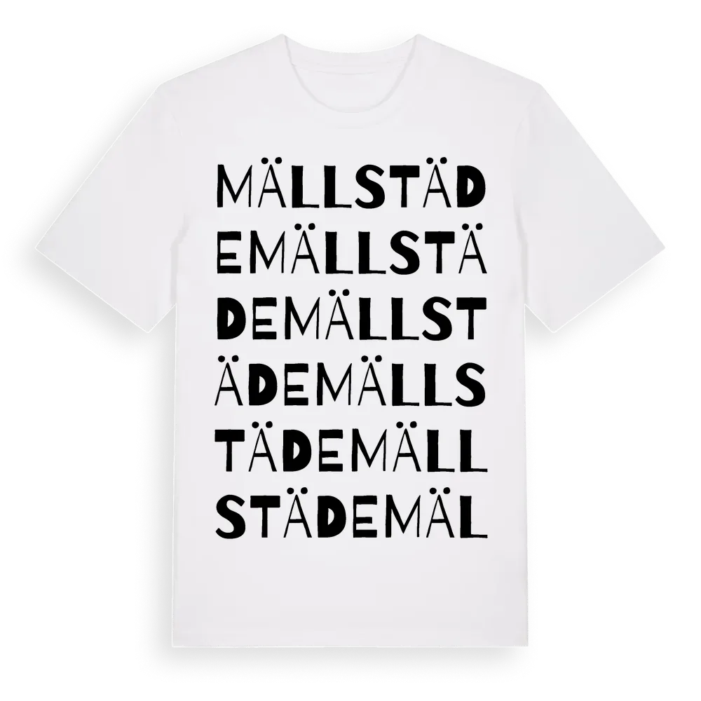 Mällstäde ordlek t-shirt är inspirerad av Mällstäde i Gotlands län, Sverige. Tröjan är designad för dig som har en speciell koppling till platsen – oavsett om du bor här, har rötterna här eller bara älskar Mällstäde.