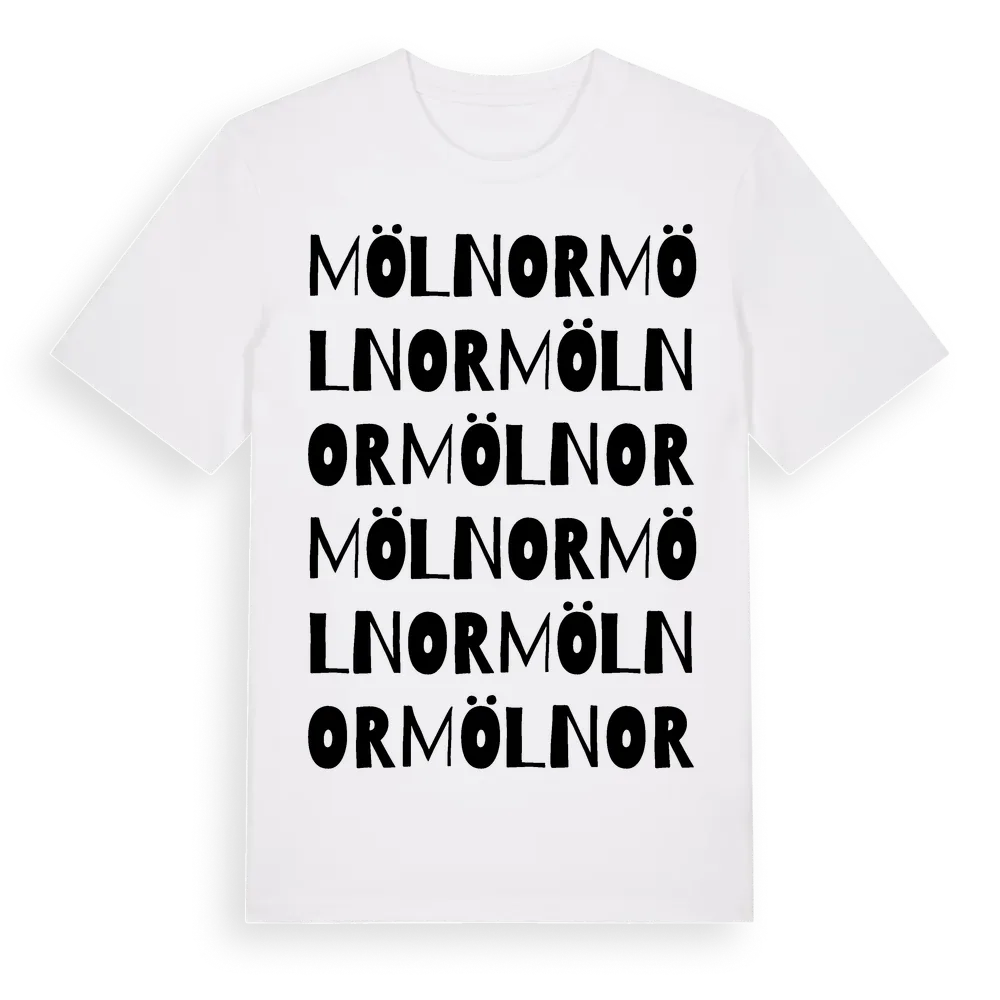 Mölnor ordlek t-shirt är inspirerad av Mölnor i Gotlands län, Sverige. Tröjan är designad för dig som har en speciell koppling till platsen – oavsett om du bor här, har rötterna här eller bara älskar Mölnor.