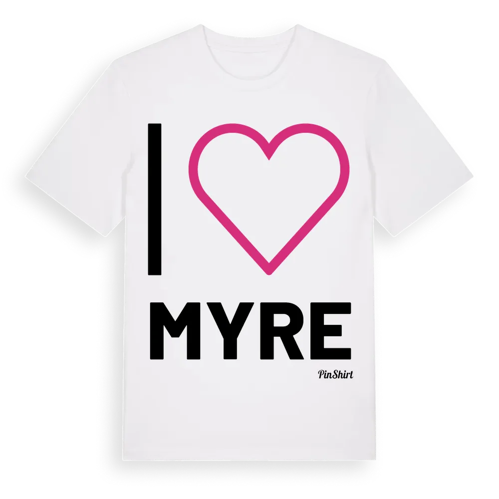 Det klassiska "I ❤ Myre"-motivet i stort format som täcker hela bröstet. För dig som vill visa kärleken till Myre på riktigt. Premium bomull, unisex – från Myre i Gotlands län.