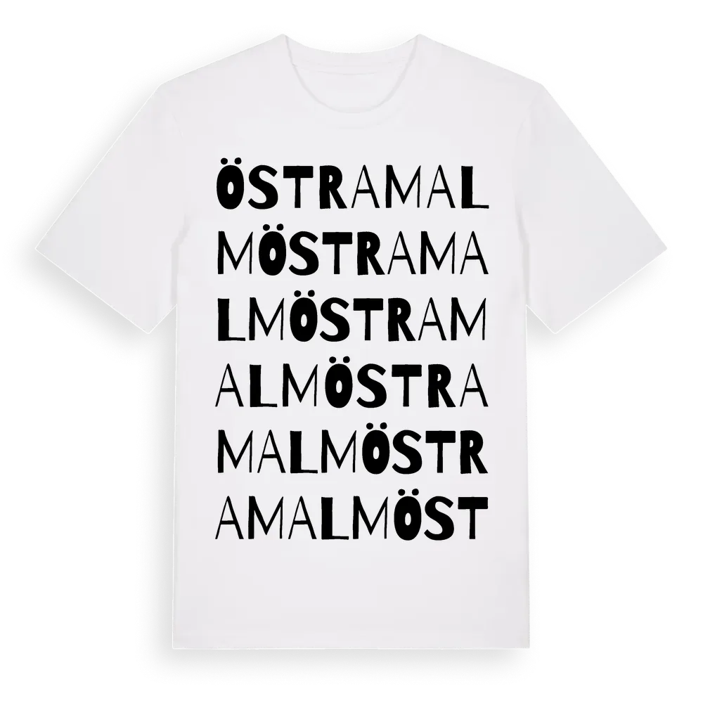 Östramalm ordlek t-shirt är inspirerad av Östramalm i Gotlands län, Sverige. Tröjan är designad för dig som har en speciell koppling till platsen – oavsett om du bor här, har rötterna här eller bara älskar Östramalm.