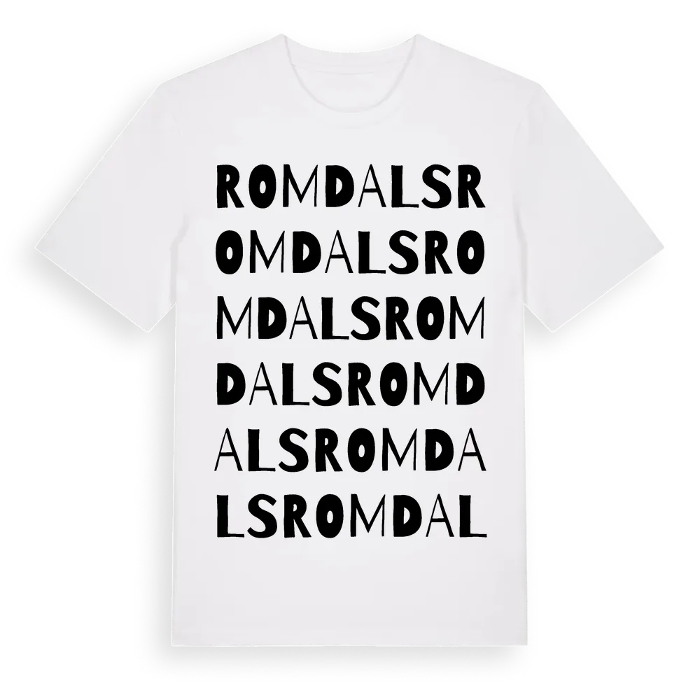 Romdals ordlek t-shirt är inspirerad av Romdals i Gotlands län, Sverige. Tröjan är designad för dig som har en speciell koppling till platsen – oavsett om du bor här, har rötterna här eller bara älskar Romdals.