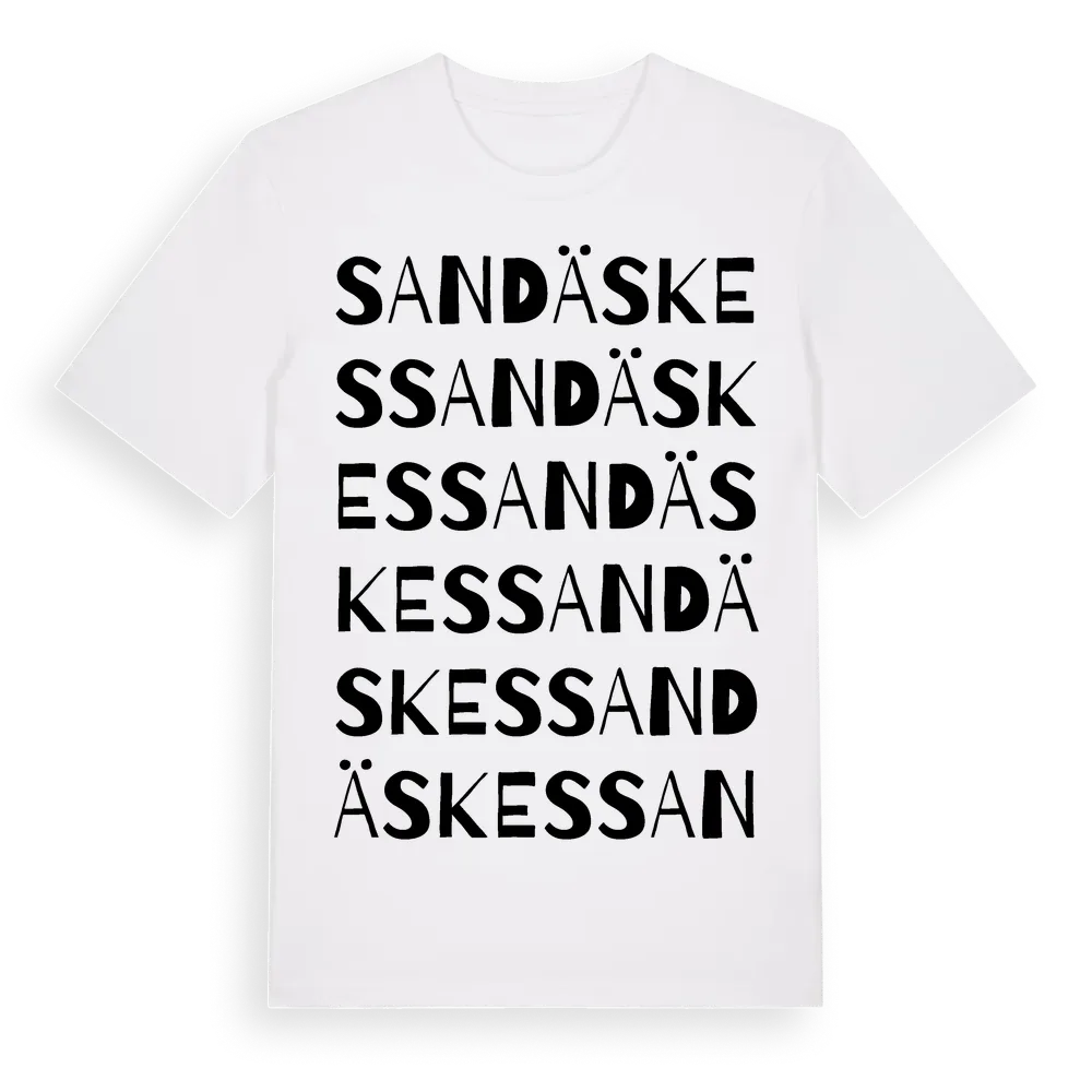 Sandäskes ordlek t-shirt är inspirerad av Sandäskes i Gotlands län, Sverige. Tröjan är designad för dig som har en speciell koppling till platsen – oavsett om du bor här, har rötterna här eller bara älskar Sandäskes.