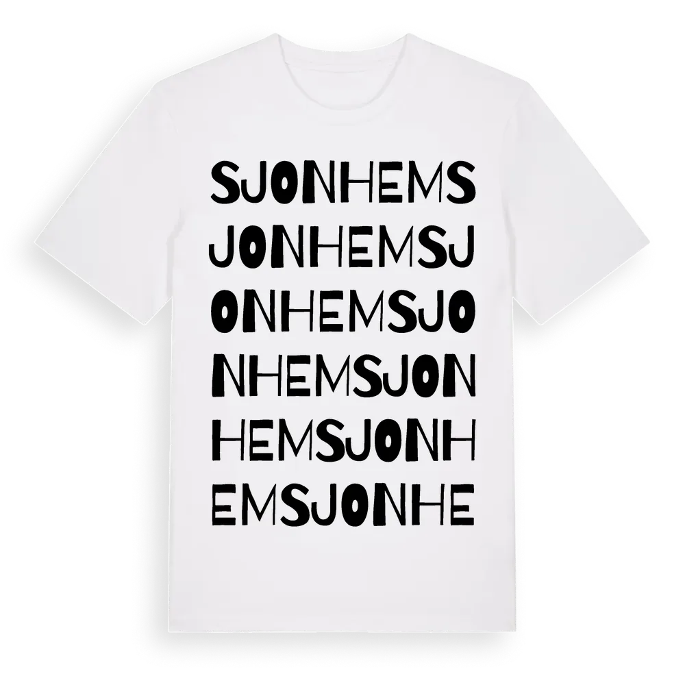 Sjonhem ordlek t-shirt är inspirerad av byn Sjonhem i Gotlands län, Sverige. Tröjan är designad för dig som har en speciell koppling till platsen – oavsett om du bor här, har rötterna här eller bara älskar Sjonhem.