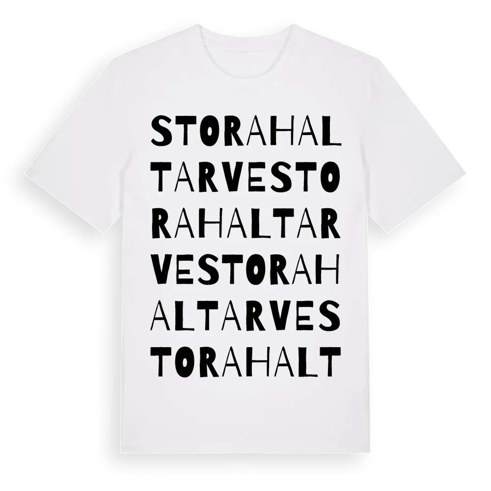Stora Haltarve ordlek t-shirt är inspirerad av Stora Haltarve i Gotlands län, Sverige. Tröjan är designad för dig som har en speciell koppling till platsen – oavsett om du bor här, har rötterna här eller bara älskar Stora Haltarve.