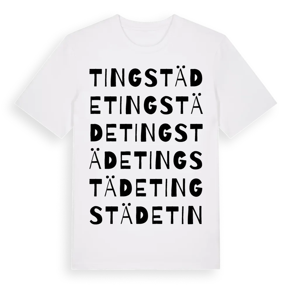 Tingstäde ordlek t-shirt är inspirerad av byn Tingstäde i Gotlands län, Sverige. Tröjan är designad för dig som har en speciell koppling till platsen – oavsett om du bor här, har rötterna här eller bara älskar Tingstäde.