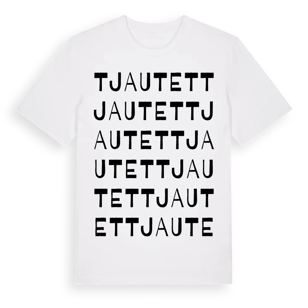 En ordlek byggd på Tjautets namn. Subtilt och klurig – ett motiv som bara de som verkligen känner platsen fullt ut förstår. Premium bomull, unisex – från Tjautet i Gotlands län.
