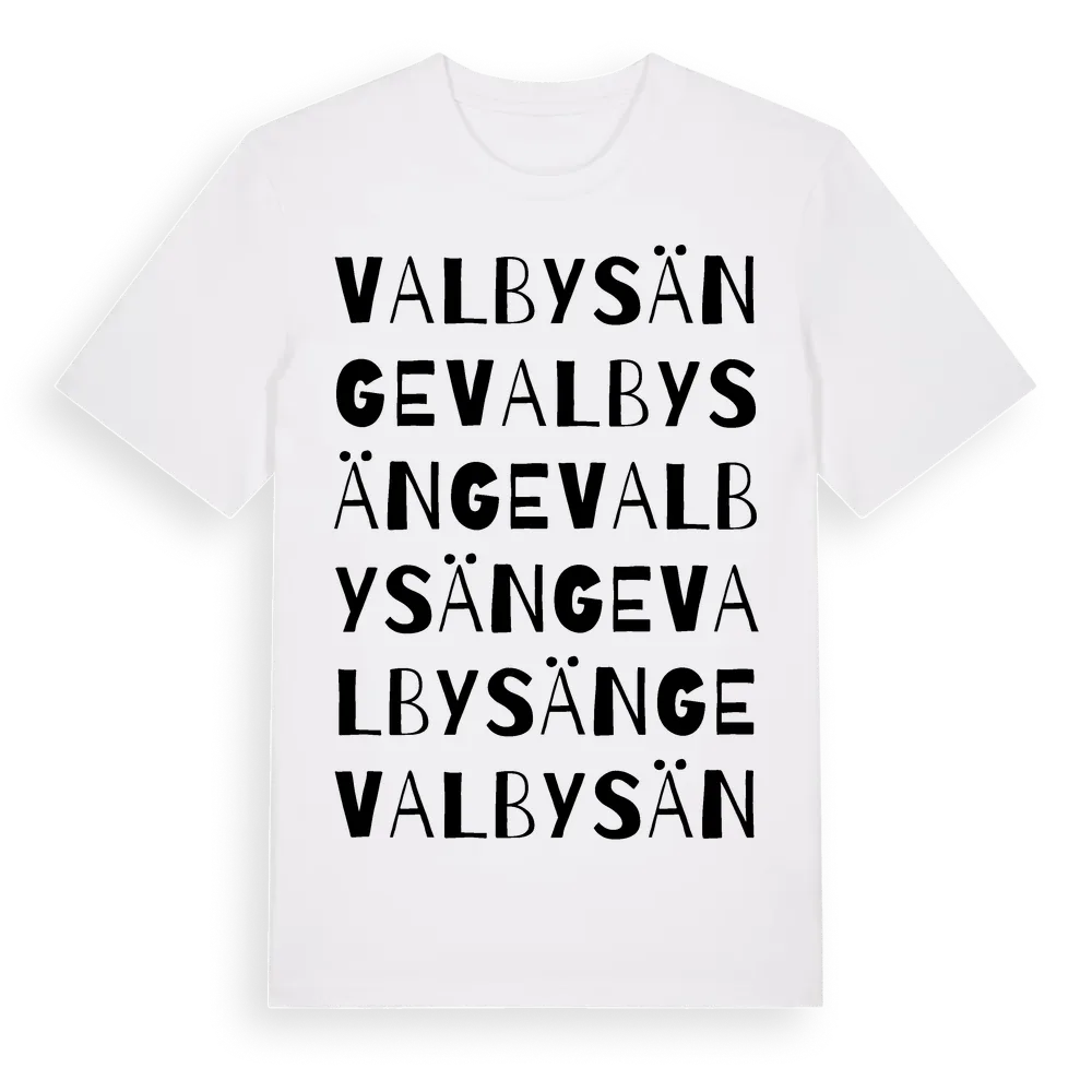 Valbysänge ordlek t-shirt är inspirerad av Valbysänge i Gotlands län, Sverige. Tröjan är designad för dig som har en speciell koppling till platsen – oavsett om du bor här, har rötterna här eller bara älskar Valbysänge.