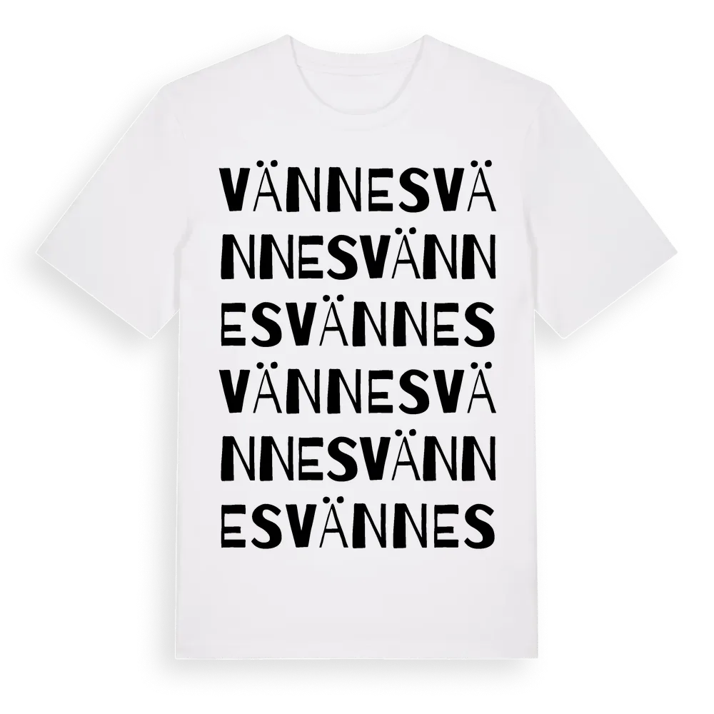 Vännes ordlek t-shirt är inspirerad av Vännes i Gotlands län, Sverige. Tröjan är designad för dig som har en speciell koppling till platsen – oavsett om du bor här, har rötterna här eller bara älskar Vännes.