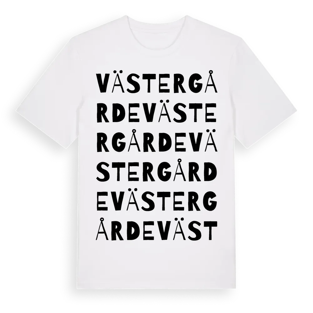 Västergårde ordlek t-shirt är inspirerad av Västergårde i Gotlands län, Sverige. Tröjan är designad för dig som har en speciell koppling till platsen – oavsett om du bor här, har rötterna här eller bara älskar Västergårde.