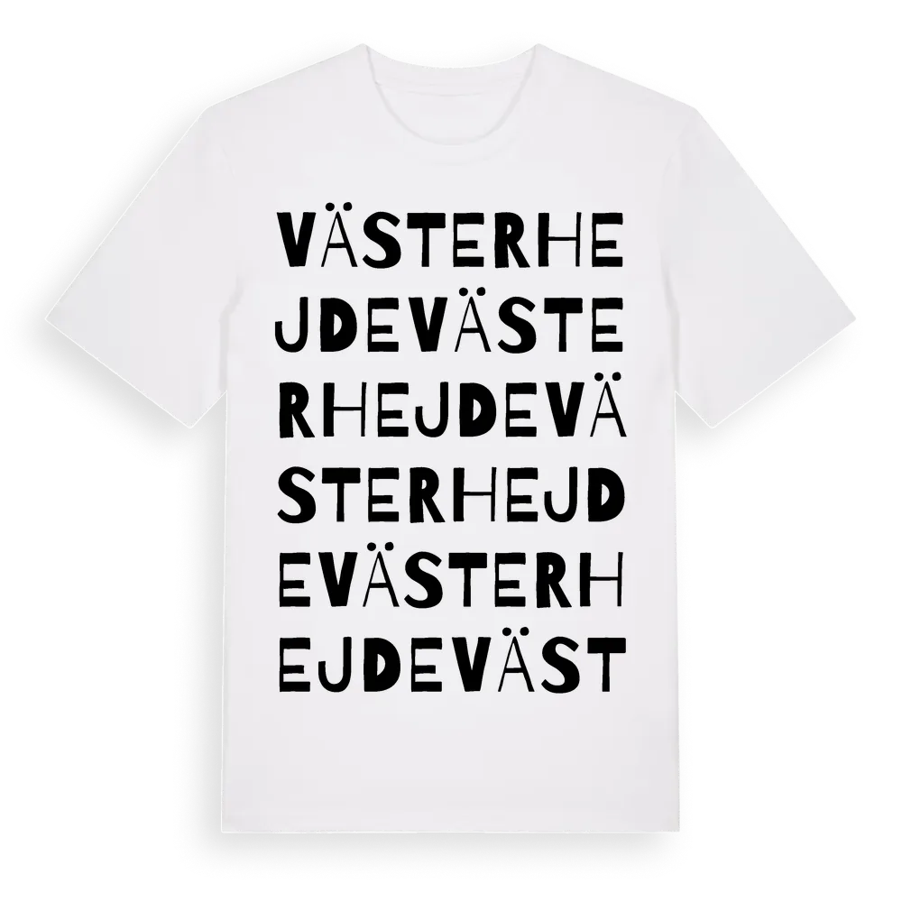 Västerhejde ordlek t-shirt är inspirerad av byn Västerhejde i Gotlands län, Sverige. Tröjan är designad för dig som har en speciell koppling till platsen – oavsett om du bor här, har rötterna här eller bara älskar Västerhejde.