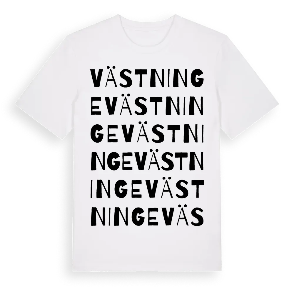 Västninge ordlek t-shirt är inspirerad av Västninge i Gotlands län, Sverige. Tröjan är designad för dig som har en speciell koppling till platsen – oavsett om du bor här, har rötterna här eller bara älskar Västninge.