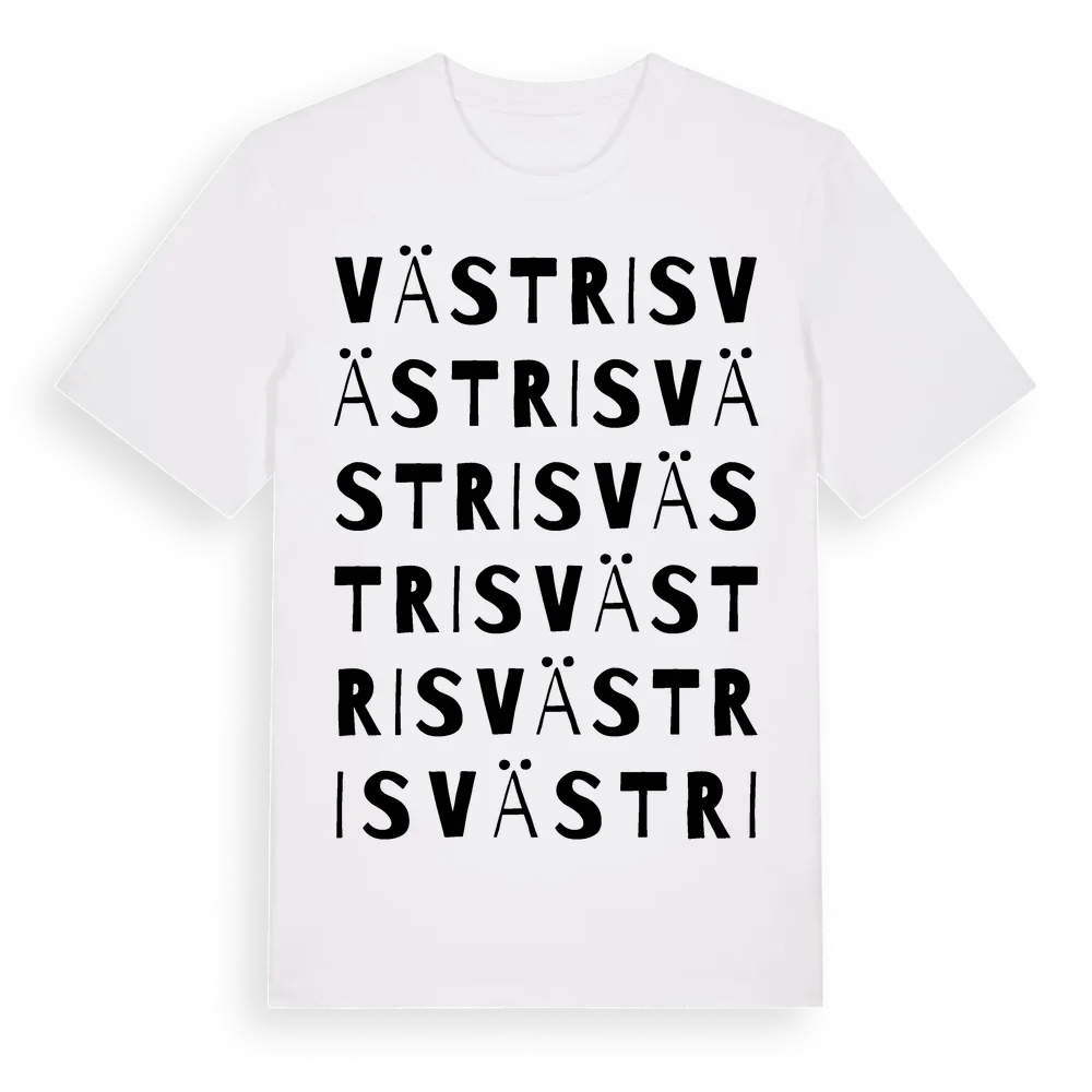 Västris ordlek t-shirt är inspirerad av Västris i Gotlands län, Sverige. Tröjan är designad för dig som har en speciell koppling till platsen – oavsett om du bor här, har rötterna här eller bara älskar Västris.