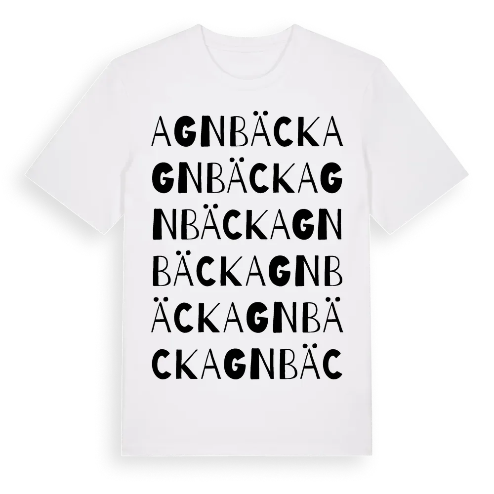 Agnbäck ordlek t-shirt är inspirerad av Agnbäck i Hallands län, Sverige. Tröjan är designad för dig som har en speciell koppling till platsen – oavsett om du bor här, har rötterna här eller bara älskar Agnbäck.