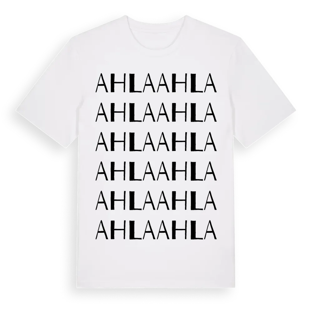 Ahla ordlek t-shirt är inspirerad av byn Ahla i Hallands län, Sverige. Tröjan är designad för dig som har en speciell koppling till platsen – oavsett om du bor här, har rötterna här eller bara älskar Ahla.
