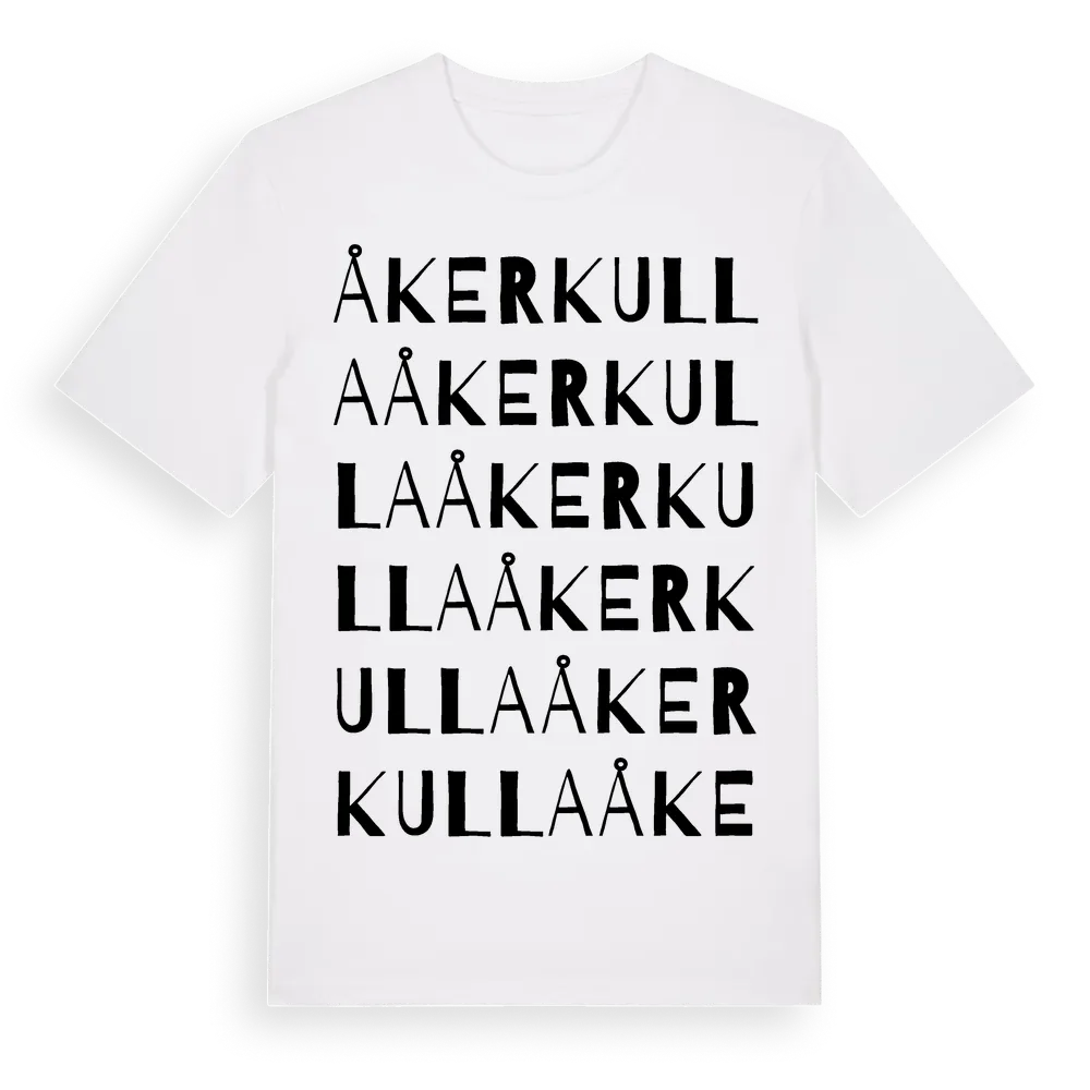 Åkerkulla ordlek t-shirt är inspirerad av Åkerkulla i Hallands län, Sverige. Tröjan är designad för dig som har en speciell koppling till platsen – oavsett om du bor här, har rötterna här eller bara älskar Åkerkulla.