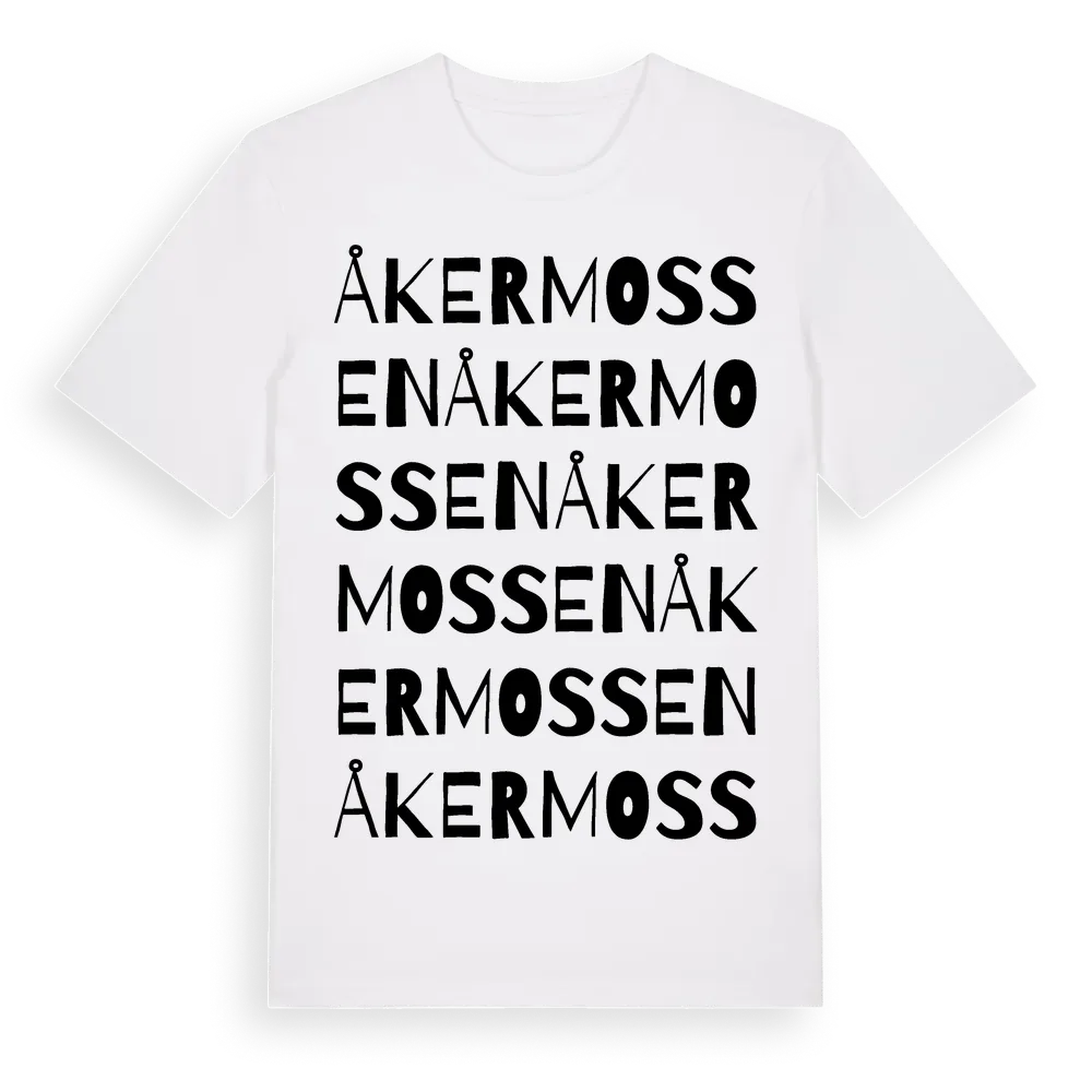 Åkermossen ordlek t-shirt är inspirerad av Åkermossen i Hallands län, Sverige. Tröjan är designad för dig som har en speciell koppling till platsen – oavsett om du bor här, har rötterna här eller bara älskar Åkermossen.