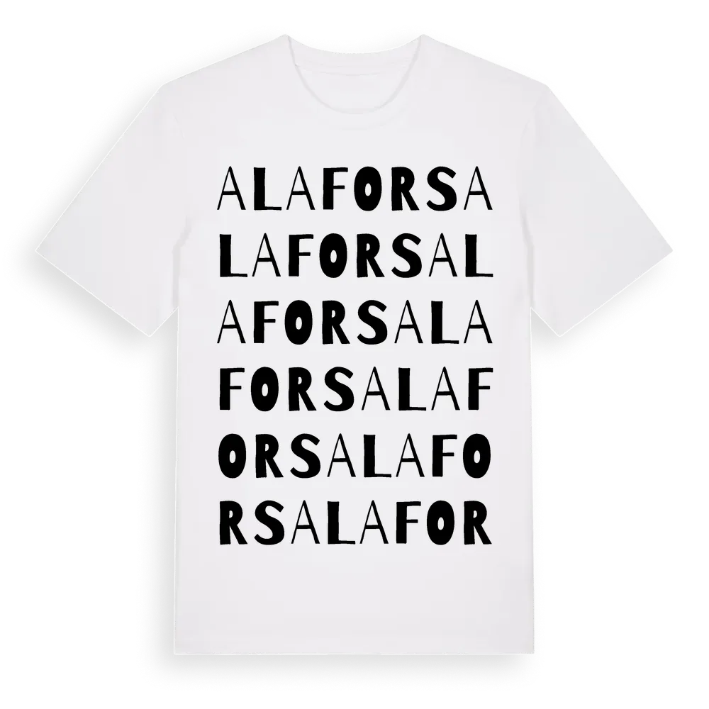 En ordlek byggd på Alaforss namn. Subtilt och klurig – ett motiv som bara de som verkligen känner platsen fullt ut förstår. Premium bomull, unisex – från byn Alafors i Hallands län.