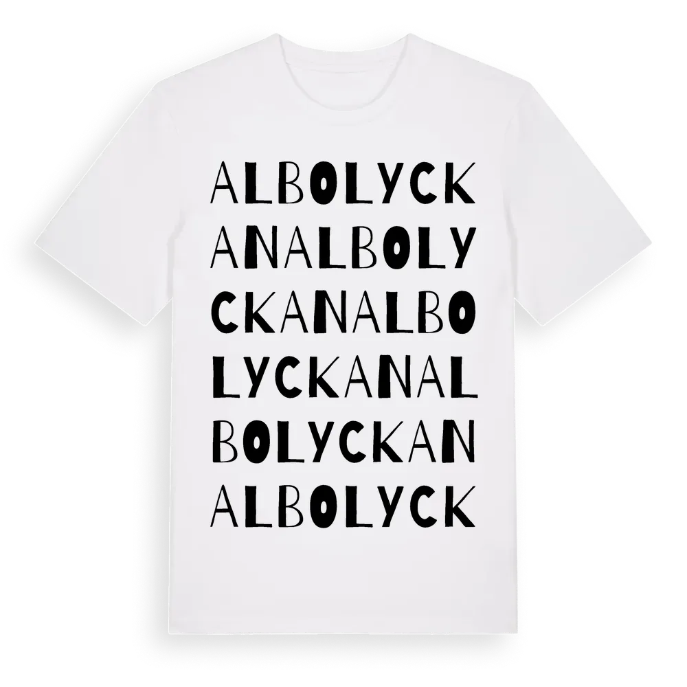 En ordlek byggd på Albolyckans namn. Subtilt och klurig – ett motiv som bara de som verkligen känner platsen fullt ut förstår. Premium bomull, unisex – från Albolyckan i Hallands län.