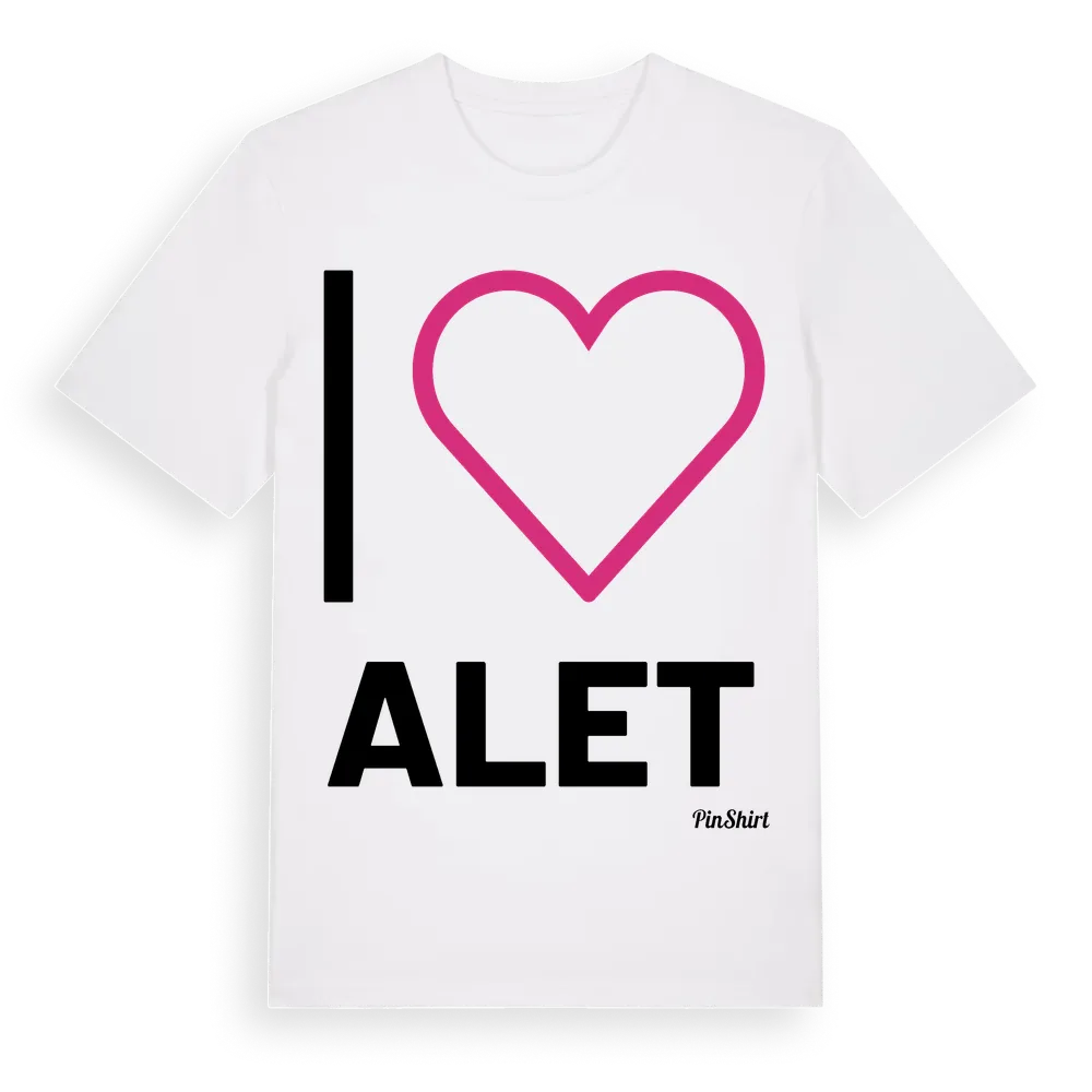 Jag älskar Alet t-shirt stort tryck är inspirerad av stadsdelen Alet i Hallands län, Sverige. Tröjan är designad för dig som har en speciell koppling till platsen – oavsett om du bor här, har rötterna här eller bara älskar Alet.