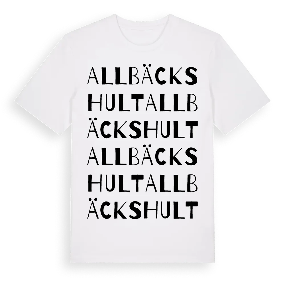 Allbäckshult ordlek t-shirt är inspirerad av Allbäckshult i Hallands län, Sverige. Tröjan är designad för dig som har en speciell koppling till platsen – oavsett om du bor här, har rötterna här eller bara älskar Allbäckshult.
