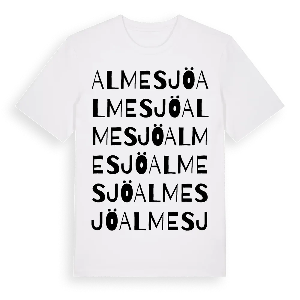 Almesjö ordlek t-shirt är inspirerad av byn Almesjö i Hallands län, Sverige. Tröjan är designad för dig som har en speciell koppling till platsen – oavsett om du bor här, har rötterna här eller bara älskar Almesjö.
