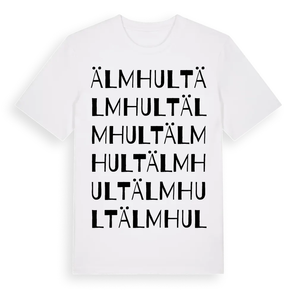 Älmhult ordlek t-shirt är inspirerad av byn Älmhult i Hallands län, Sverige. Tröjan är designad för dig som har en speciell koppling till platsen – oavsett om du bor här, har rötterna här eller bara älskar Älmhult.