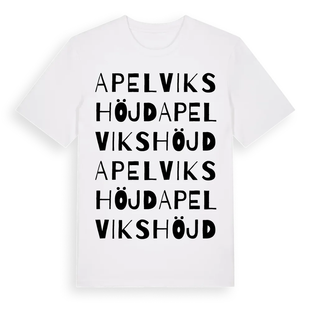 Apelvikshöjd ordlek t-shirt är inspirerad av stadsdelen Apelvikshöjd i Hallands län, Sverige. Tröjan är designad för dig som har en speciell koppling till platsen – oavsett om du bor här, har rötterna här eller bara älskar Apelvikshöjd.