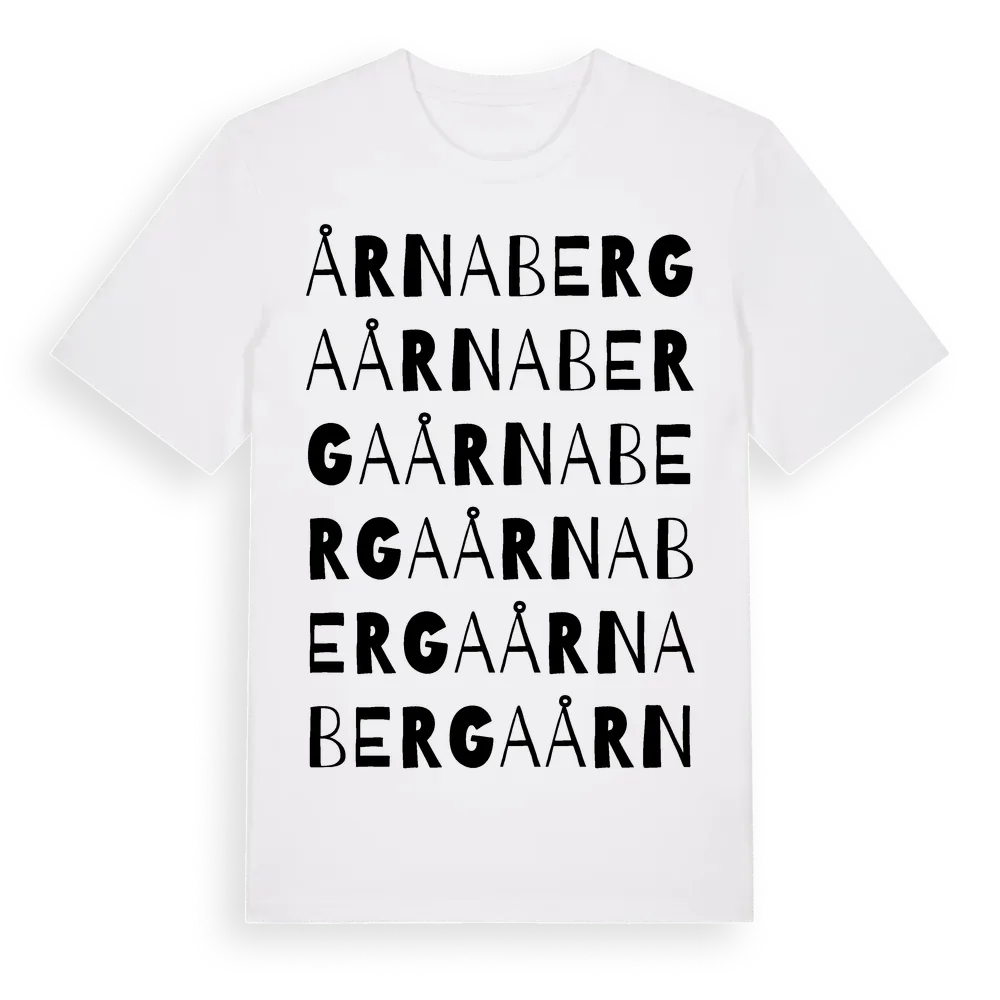 Årnaberga ordlek t-shirt är inspirerad av byn Årnaberga i Hallands län, Sverige. Tröjan är designad för dig som har en speciell koppling till platsen – oavsett om du bor här, har rötterna här eller bara älskar Årnaberga.