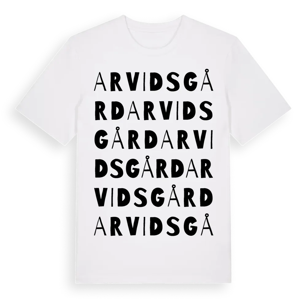 Arvidsgård ordlek t-shirt är inspirerad av Arvidsgård i Hallands län, Sverige. Tröjan är designad för dig som har en speciell koppling till platsen – oavsett om du bor här, har rötterna här eller bara älskar Arvidsgård.