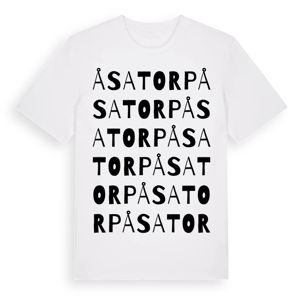 Åsatorp ordlek t-shirt är inspirerad av Åsatorp i Hallands län, Sverige. Tröjan är designad för dig som har en speciell koppling till platsen – oavsett om du bor här, har rötterna här eller bara älskar Åsatorp.