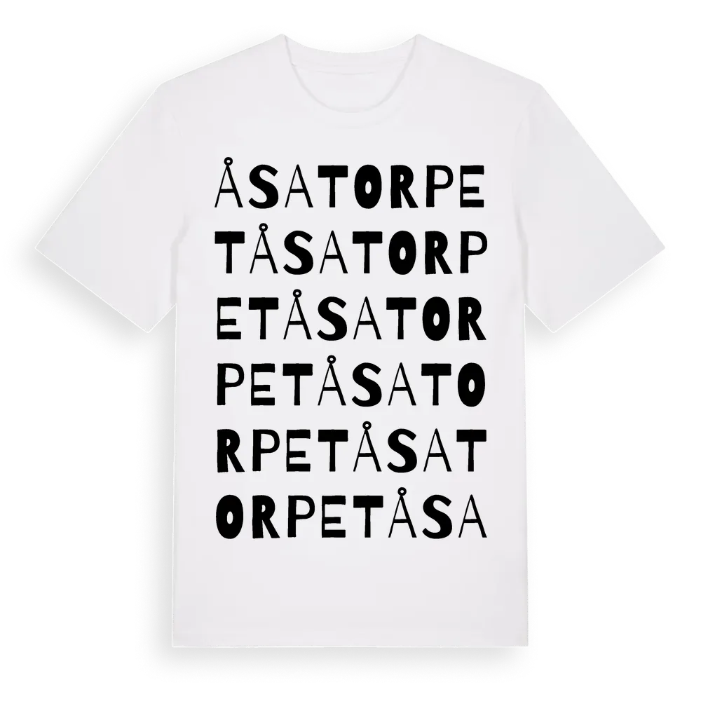Åsatorpet ordlek t-shirt är inspirerad av Åsatorpet i Hallands län, Sverige. Tröjan är designad för dig som har en speciell koppling till platsen – oavsett om du bor här, har rötterna här eller bara älskar Åsatorpet.