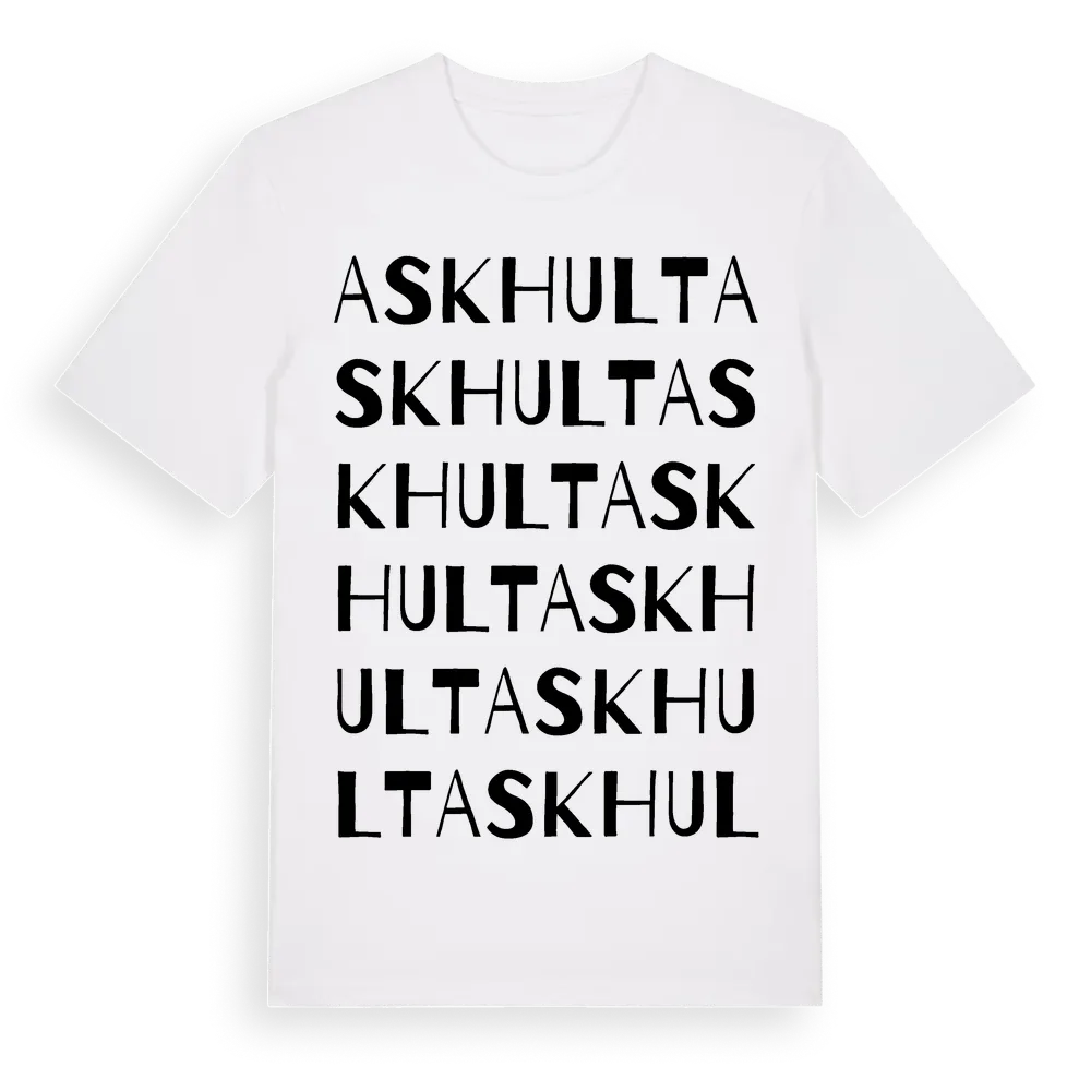 Askhult ordlek t-shirt är inspirerad av Askhult i Hallands län, Sverige. Tröjan är designad för dig som har en speciell koppling till platsen – oavsett om du bor här, har rötterna här eller bara älskar Askhult.