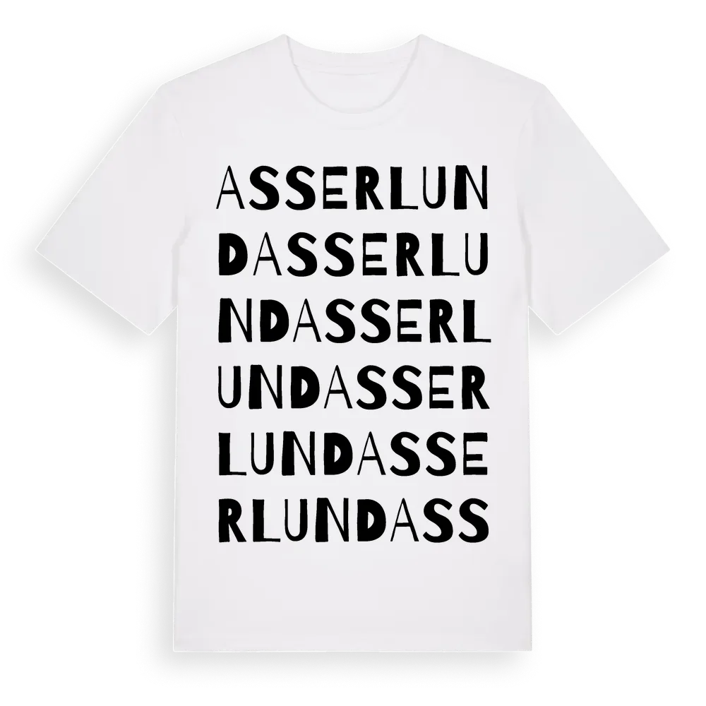 Asserlund ordlek t-shirt är inspirerad av Asserlund i Hallands län, Sverige. Tröjan är designad för dig som har en speciell koppling till platsen – oavsett om du bor här, har rötterna här eller bara älskar Asserlund.