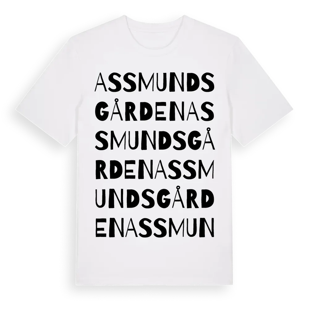 Assmundsgården ordlek t-shirt är inspirerad av Assmundsgården i Hallands län, Sverige. Tröjan är designad för dig som har en speciell koppling till platsen – oavsett om du bor här, har rötterna här eller bara älskar Assmundsgården.