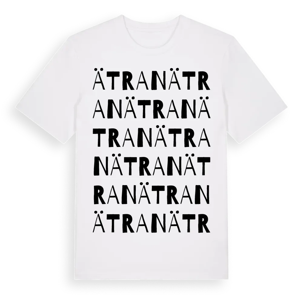 Ätran ordlek t-shirt är inspirerad av byn Ätran i Hallands län, Sverige. Tröjan är designad för dig som har en speciell koppling till platsen – oavsett om du bor här, har rötterna här eller bara älskar Ätran.