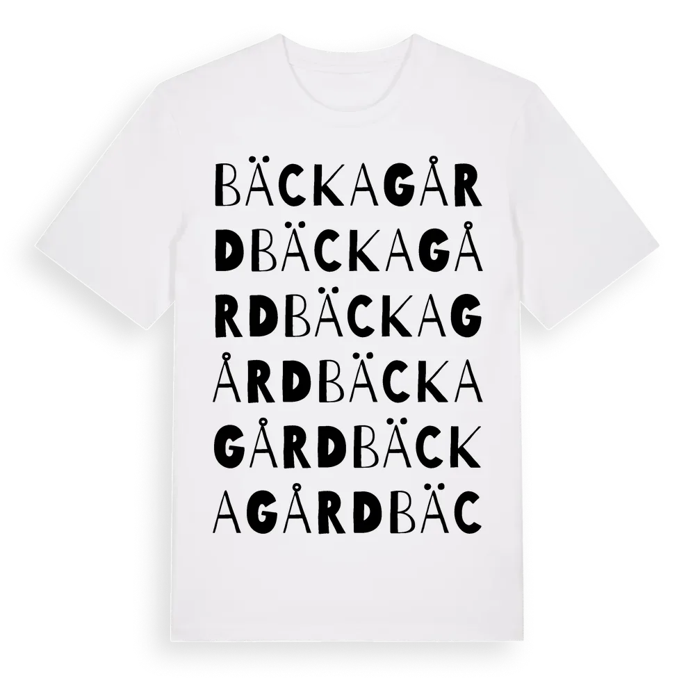 Bäckagård ordlek t-shirt är inspirerad av Bäckagård i Hallands län, Sverige. Tröjan är designad för dig som har en speciell koppling till platsen – oavsett om du bor här, har rötterna här eller bara älskar Bäckagård.